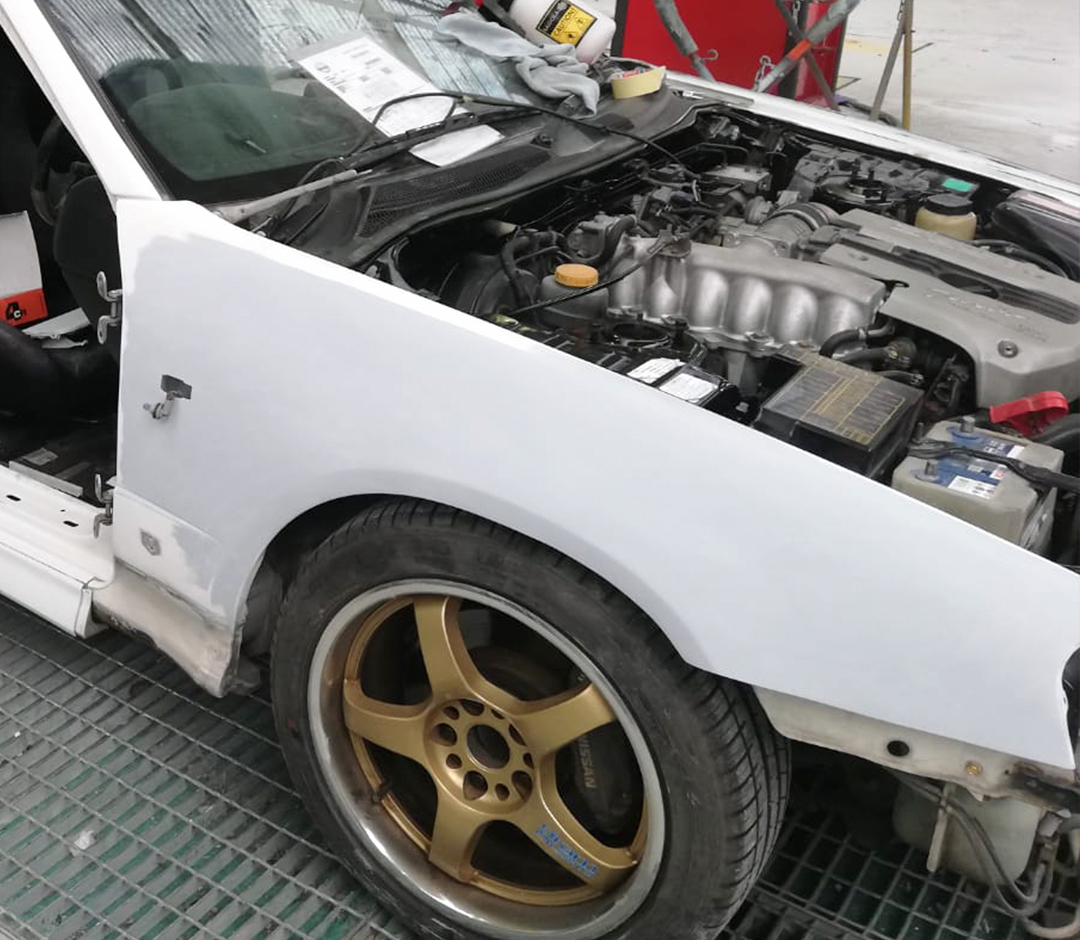 La carrocería fue completamente trabajada para garantizar la correcta instalación de los componentes de la réplica. Se prestó especial atención a la calidad de los materiales utilizados, asegurando un acabado impecable y duradero. La pintura fue realizada en base a los estándares Nismo, lo que permitió obtener una réplica visualmente auténtica.