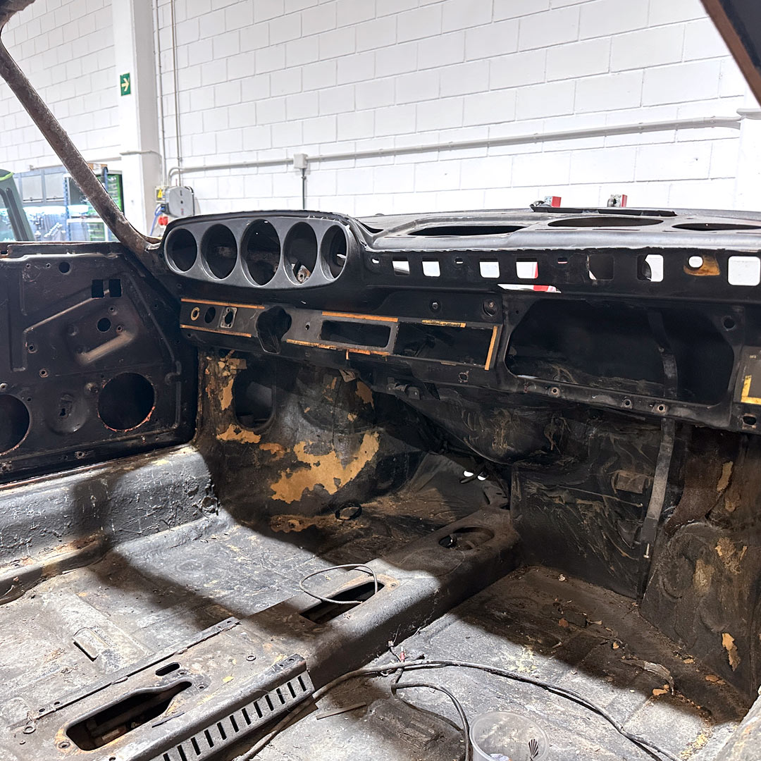 Vehículo Porsche 911T 2.4 de 1973, un proyecto que destaca por su exigencia técnica y atención meticulosa a los detalles. Hemos realizando el desmontaje completo del vehículo y la preparación de la carrocería para el proceso de chorreo, una etapa esencial que permitirá eliminar cualquier residuo de pintura y signos de corrosión, garantizando una superficie completamente limpia y una carrocería totalmente saneada.
