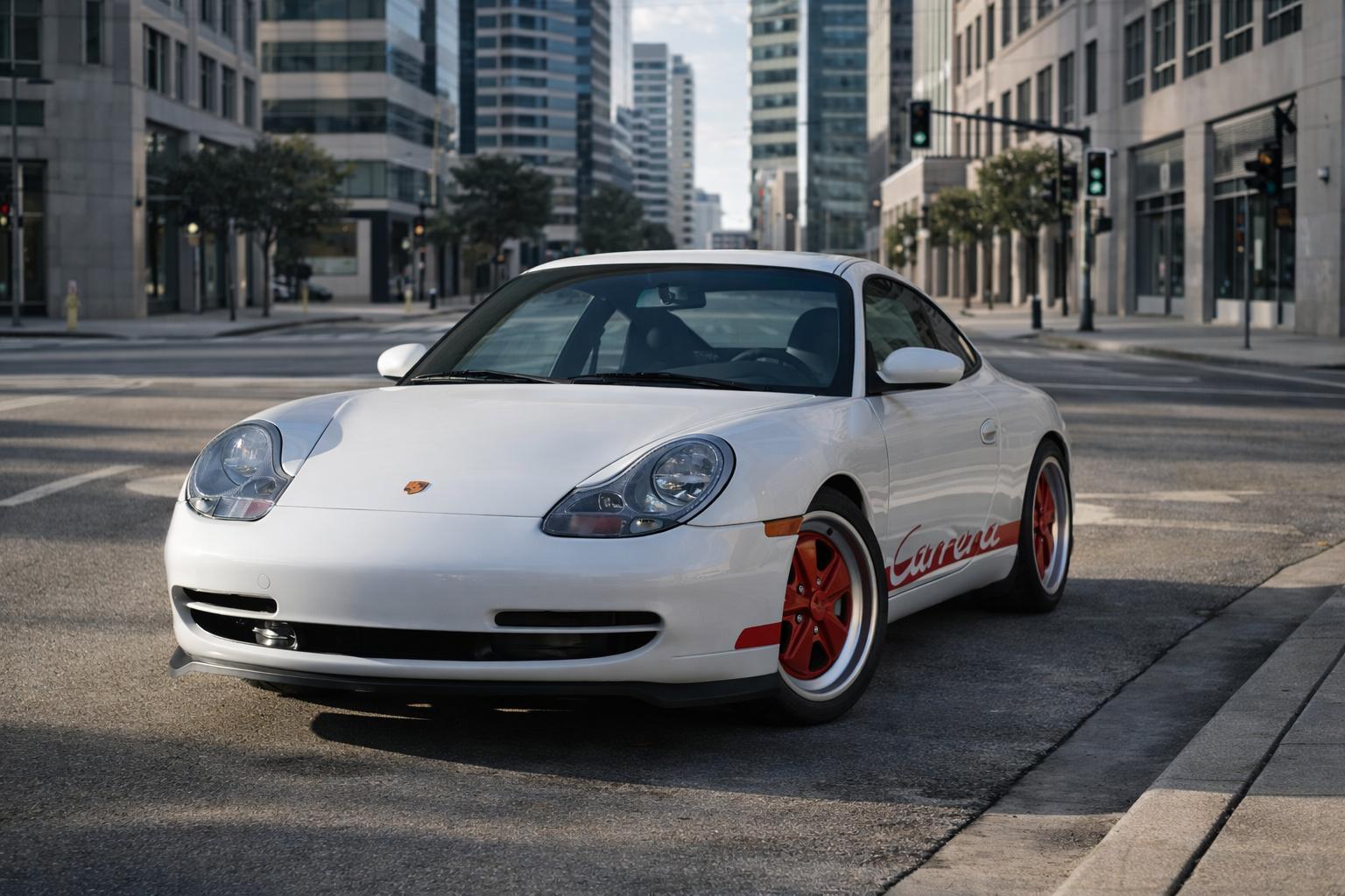 Este Porsche 911 Carrera de la generación 996 representa el inicio de la era moderna del 911, combinando diseño clásico con ingeniería contemporánea. Esta unidad destaca por su atractiva configuración en blanco con detalles deportivos en rojo, que refuerzan su carácter dinámico. Un deportivo icónico que ofrece sensaciones de conducción puras y una estética distintiva dentro de la gama 911.